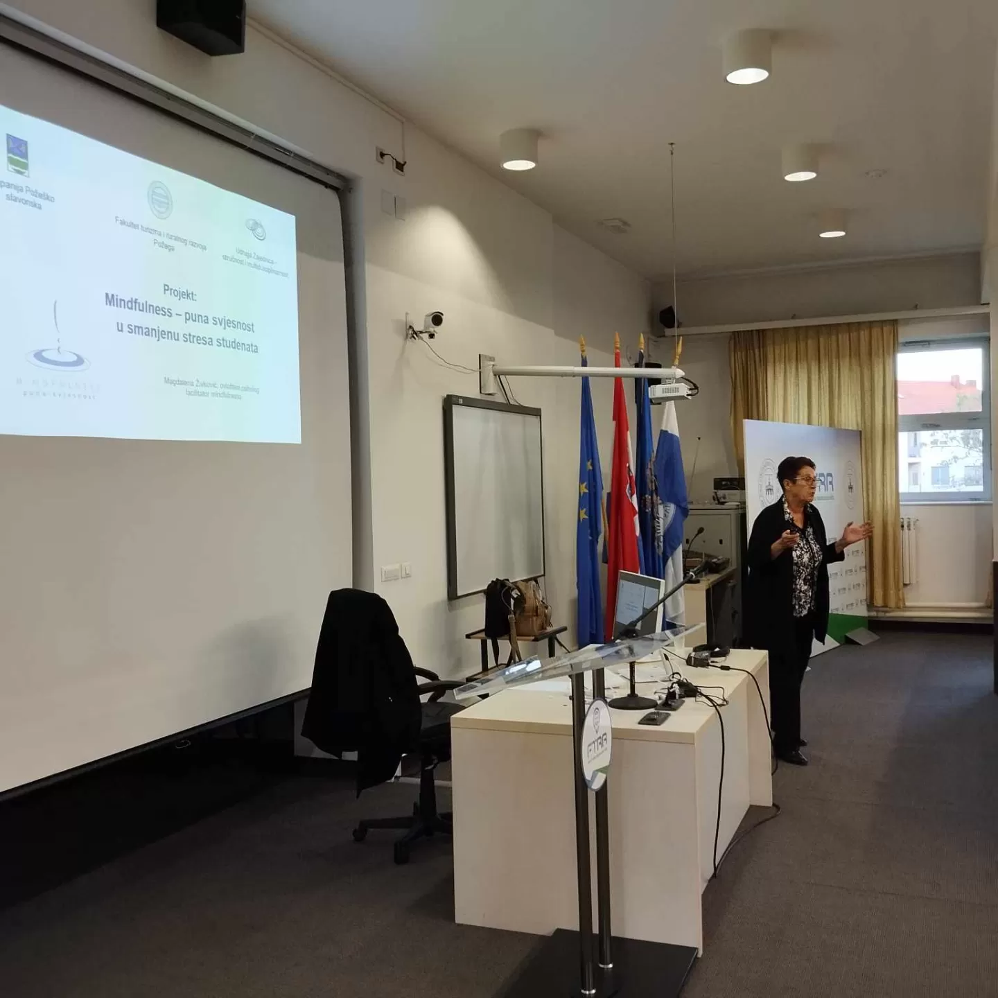 "Mindfulness - puna svjesnost u smanjenju stresa studenata", ciklus je radionica održanih na Fakultetu turizma i ruralnog razvoja u Požegi pod vodstvom Magdalene Živković, ovlaštene psihologinje facilitatorice mindfulnessa. Mindfulness je izuzetno koristan alat za dugoročno treniranje mozga kako bi postao otporniji na stres, uz istovremeno učenje mijenjanja načina na koji se osoba odnosi prema sebi, svojim mislima i osjetima. Zahvaljujemo se voditeljici radionica i svim studentima koji su sudjelovali na radionicama.